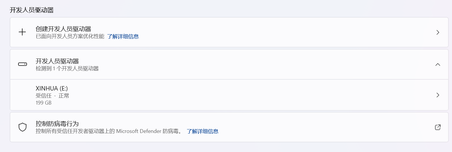 这里发现了一个 Windows 11 的新功能 - 开发人员驱动器(Dev Drive),似乎是用 ReFS + 异步 Windows Defender 扫描来增强小文件处理的性能,因此在 C 盘建了一个 VHDX 并把 Dev Drive 建在上面。