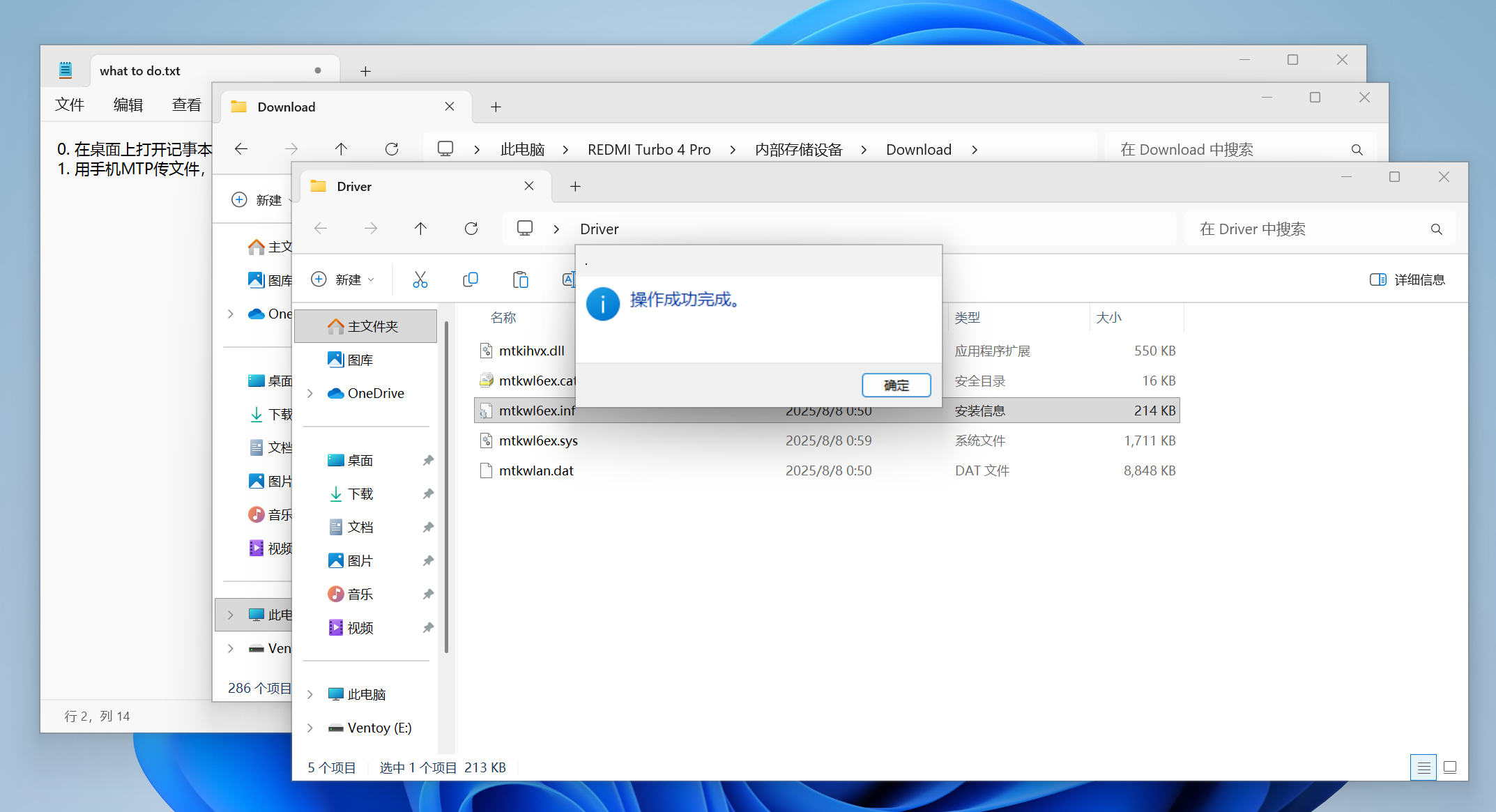 因为大部分内容都已经在 Autounattend.xml 里填掉了,因此 OOBE 也只有创建应用一个操作就直接进入系统了。然而这块 MT7621 仍然没有网卡驱动,因此继续用手机 MTP 上复制一份驱动安装上。