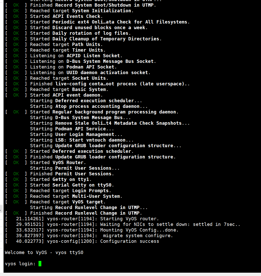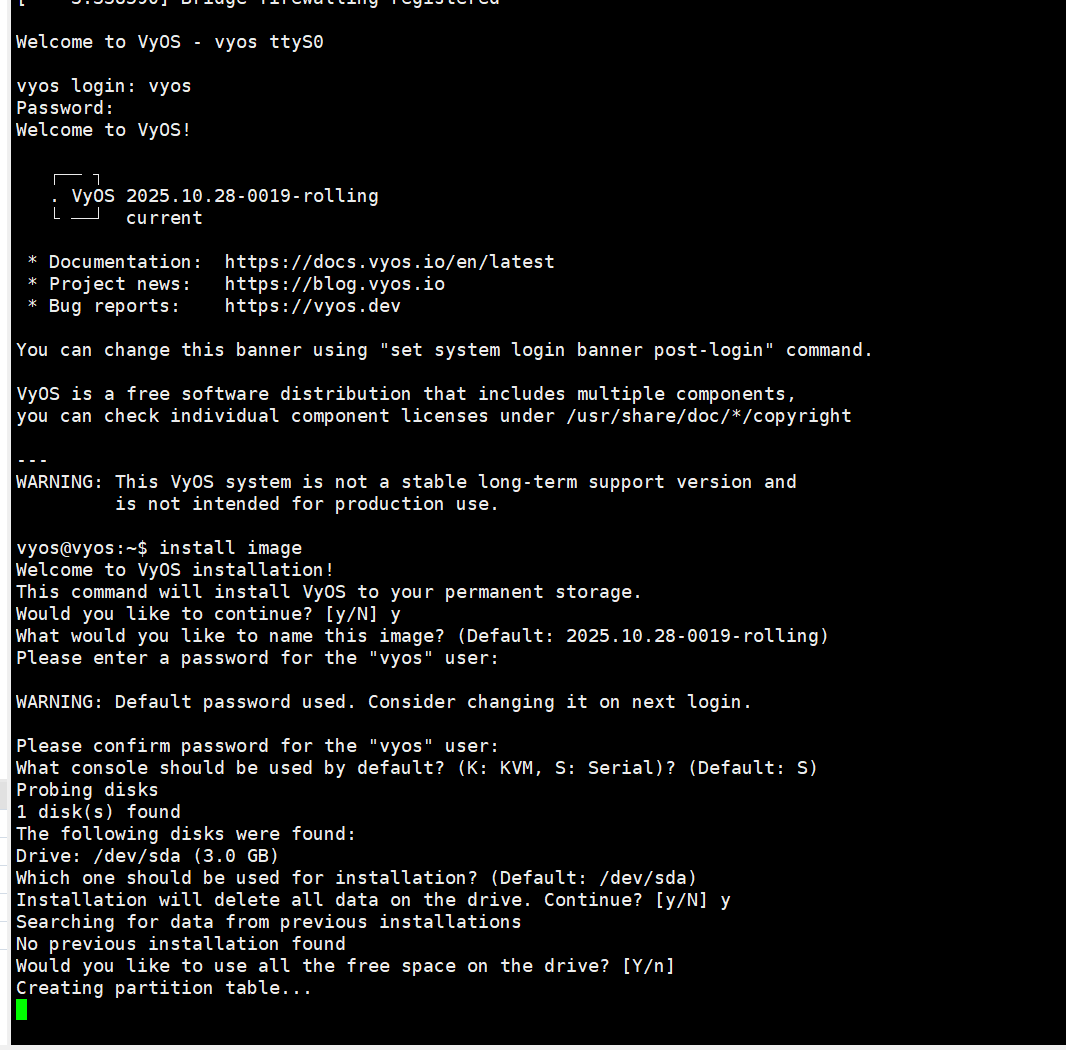进入系统后,使用默认用户名密码(均是 vyos)登录系统,再敲 install image 即可进入安装向导。
