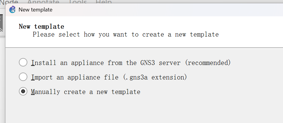 接下来在 GNS3 的图形化界面选择 File-New Template,选择 “Manually create ......”