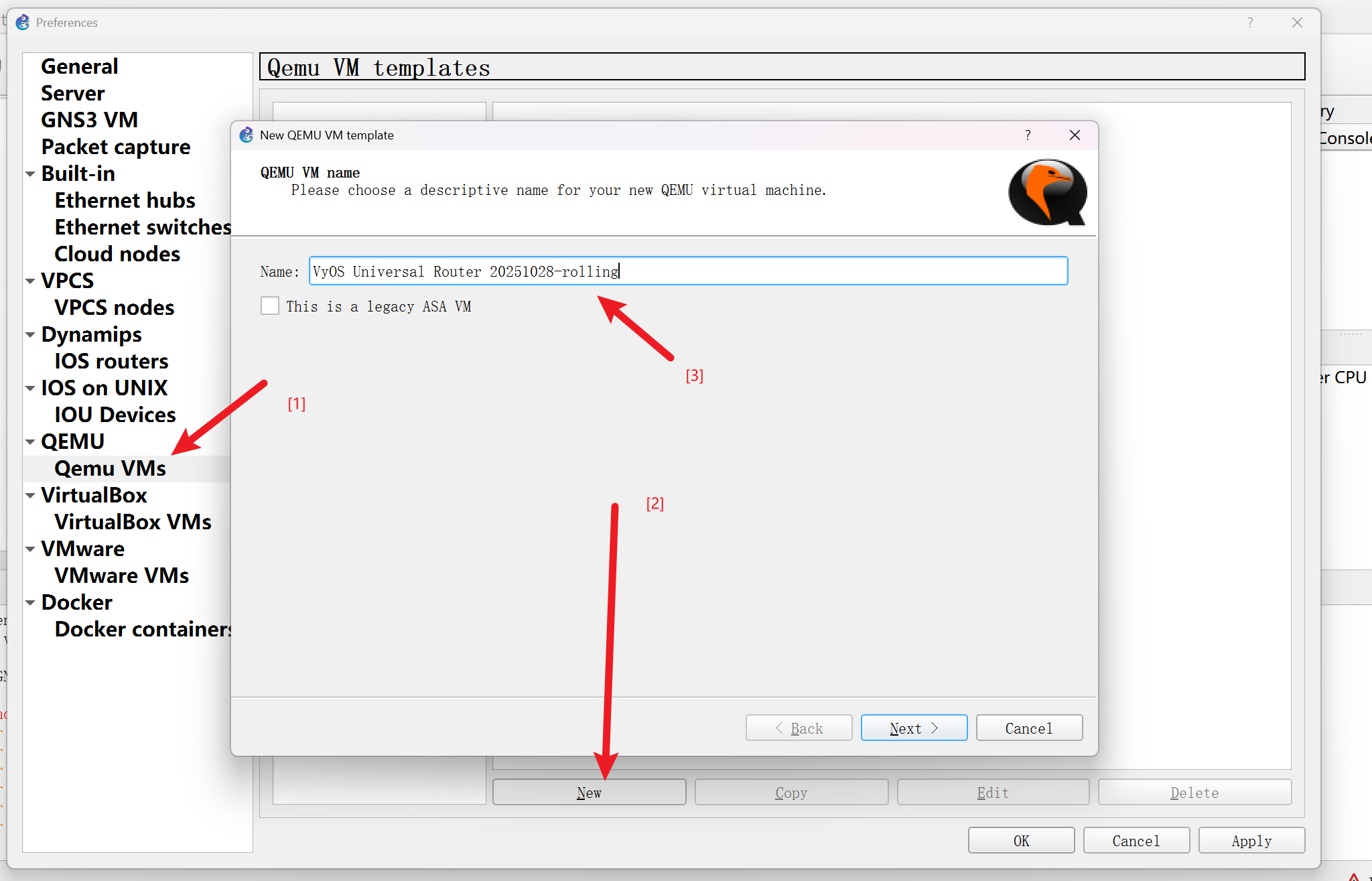 此处的 UI/UX 设计得比较令人迷惑,直接打开了 GNS3 的 Preferences 窗口。这里需要在左边选择 “Qemu VMs”,并点下面的“New”。填好名字下一步。
