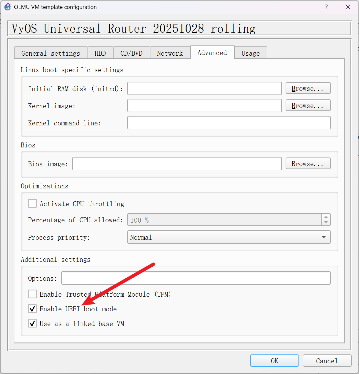 由于笔者用 UEFI 安装的,因此 Advanced 选项卡的这里也要勾上。最后 OK 保存,并开个 Project 把刚刚创建的 VyOS Appliance 放下来,右键开机看看是否能正常启动。